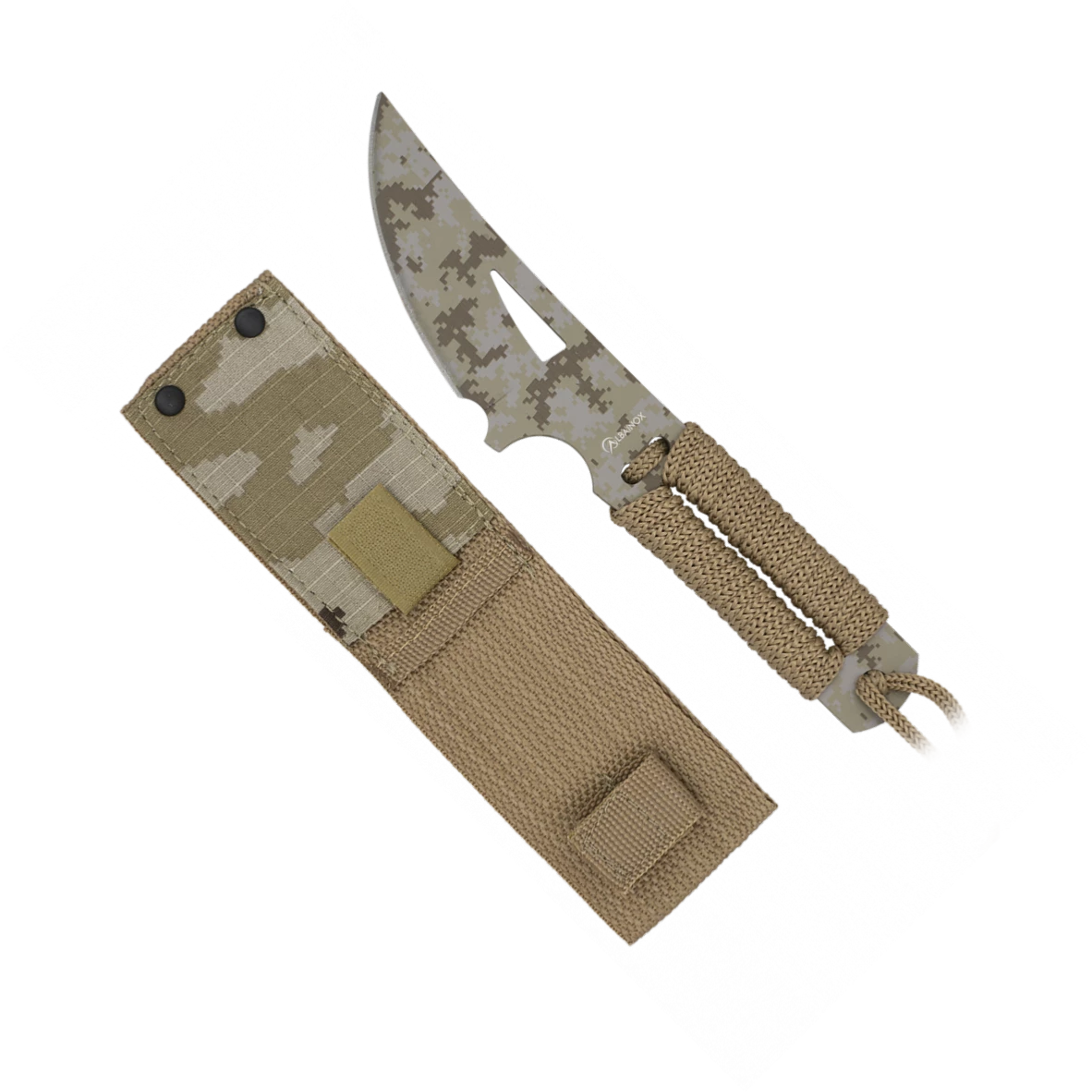 Couteau Albainox d’une longueur de 19 cm avec lame trailing point en acier inox 3Cr13Mov finition camo aride. Manche encordé coyote. Vendu avec étui nylon.