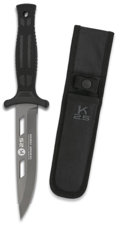 Couteau BOTERO K25 32193 : lame acier 7Cr17Mov avec revêtement titane longueur 12.8 cm épaisseur 4 mm, manche en caoutchouc noir. Longueur totale du couteau 23.5 cm. Étui ouverture rapide et clip arrière.