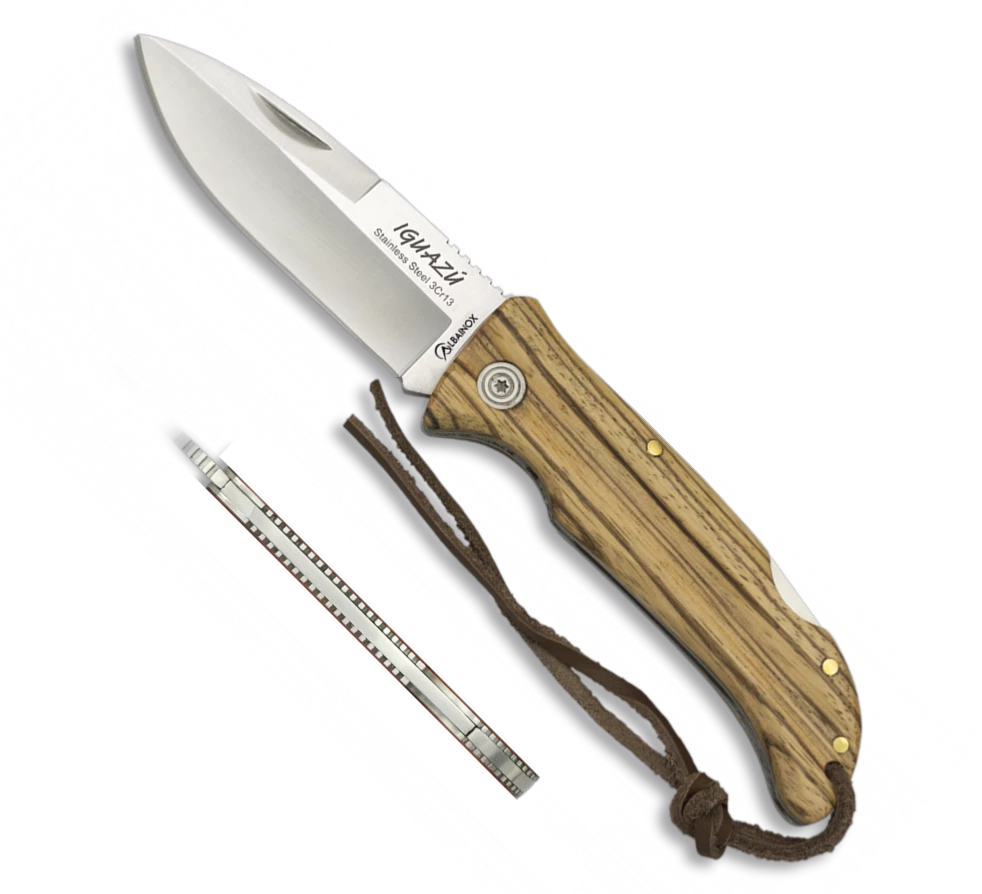 Ce couteau de poche ALBAINOX modèle IGUAZU 19984 se compose d’une lame en acier inox 3Cr13Mov d’une longueur de 9 cm avec un manche en bois zebra et de plaquettes inox agrémentées d’un décor guilloché. Un trou situé au bout du manche laisse passer une lanière en cuir.