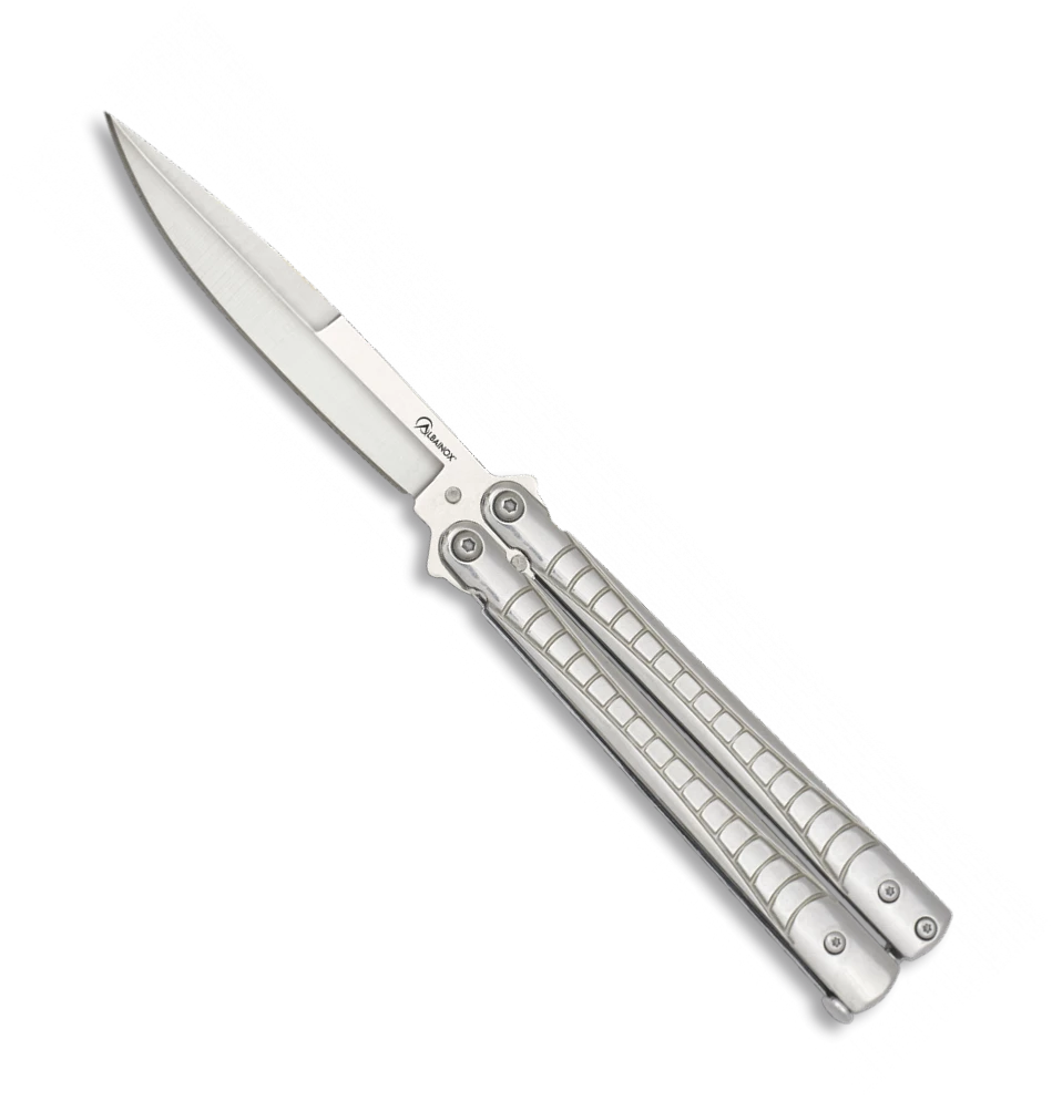 Couteau papillon Albainox 02211, lame en acier 3Cr13Mov longueur 9.7 cm. Manche en acier avec motif.