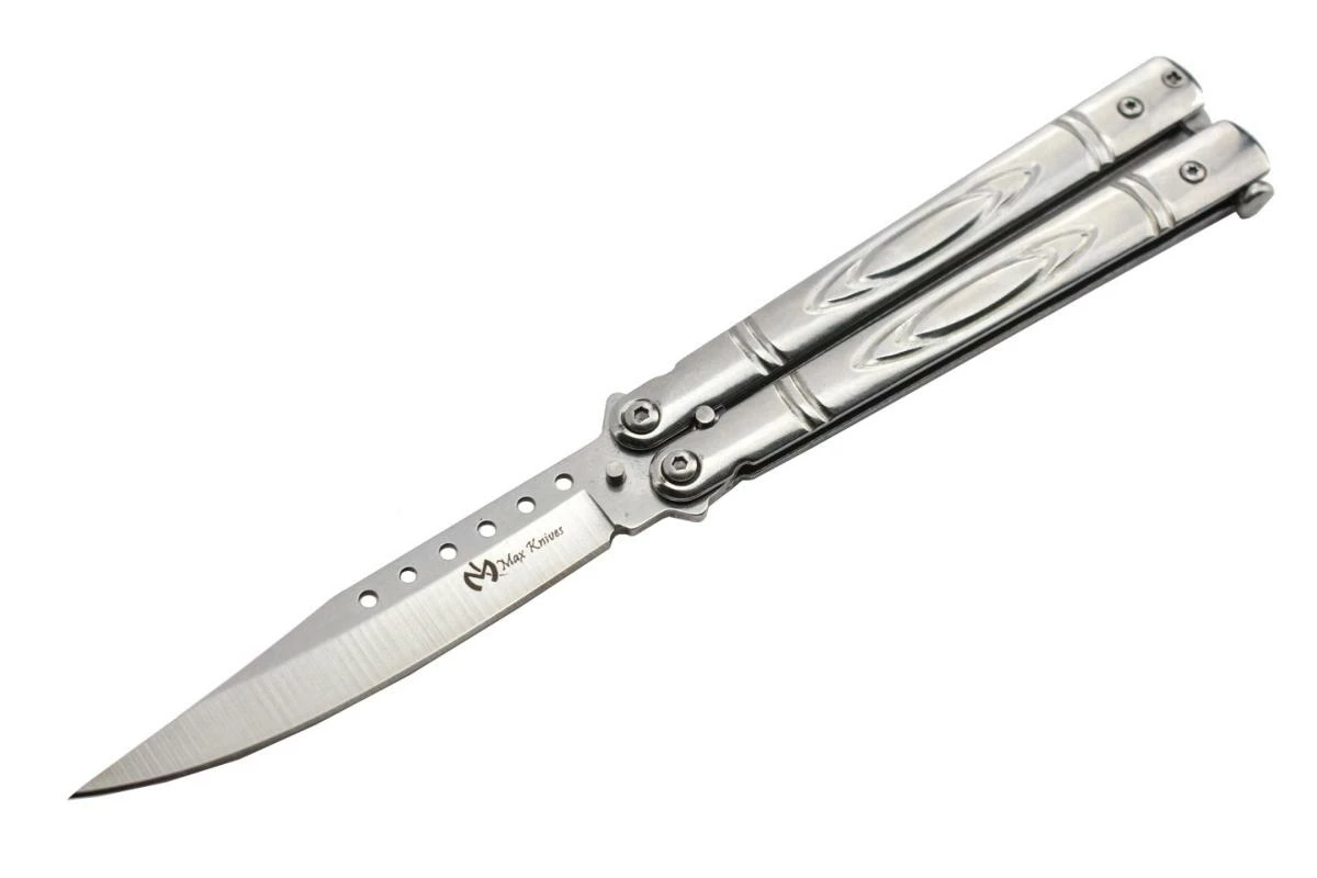 Couteau papillon Maxknives P55S, lame acier inox finition silver longueur 9.8 cm et manche en acier silver.