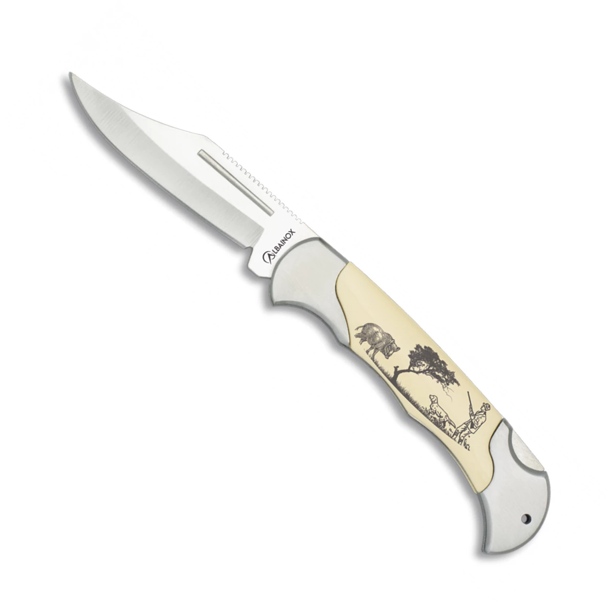 Couteau pliant Albainox 19661GR562, lame acier inox longueur 8 cm, manche aluminium et plastique avec décor Chasse.