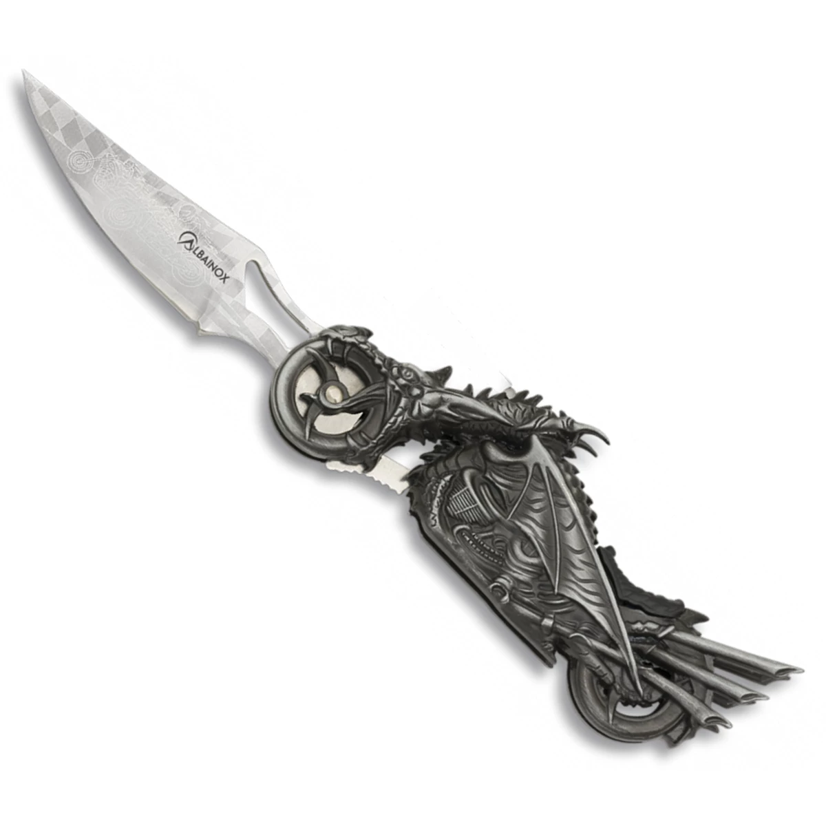 Couteau pliant Albainox 18062, lame acier inox longueur 8.5 cm avec décoration laser et manche en aluminium représentant une moto.