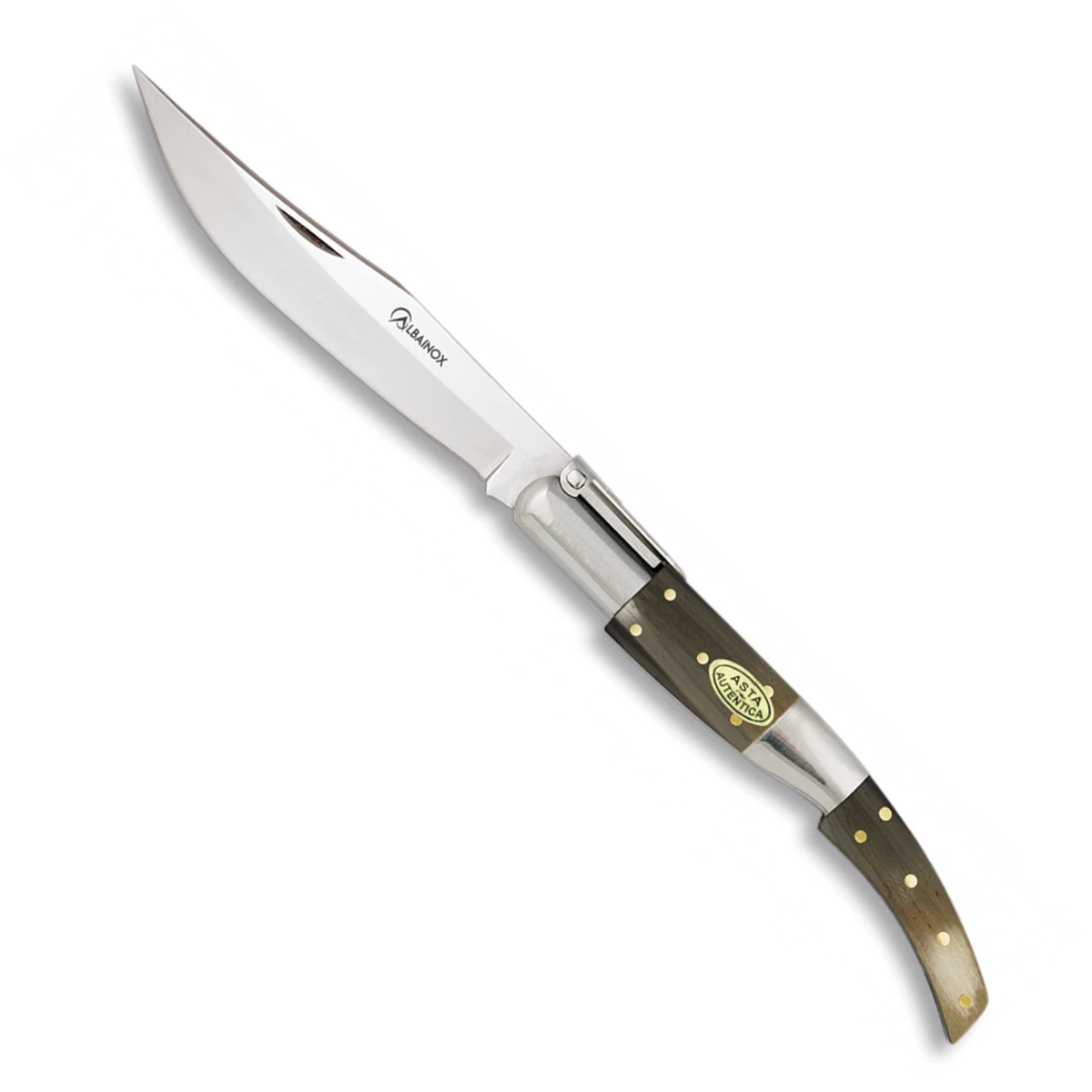 Couteau pliant ARABE CARRACA : lame inox disponible en longueurs 12 ou 13.5 cm, manche en corne de taureau, virole aluminium.
