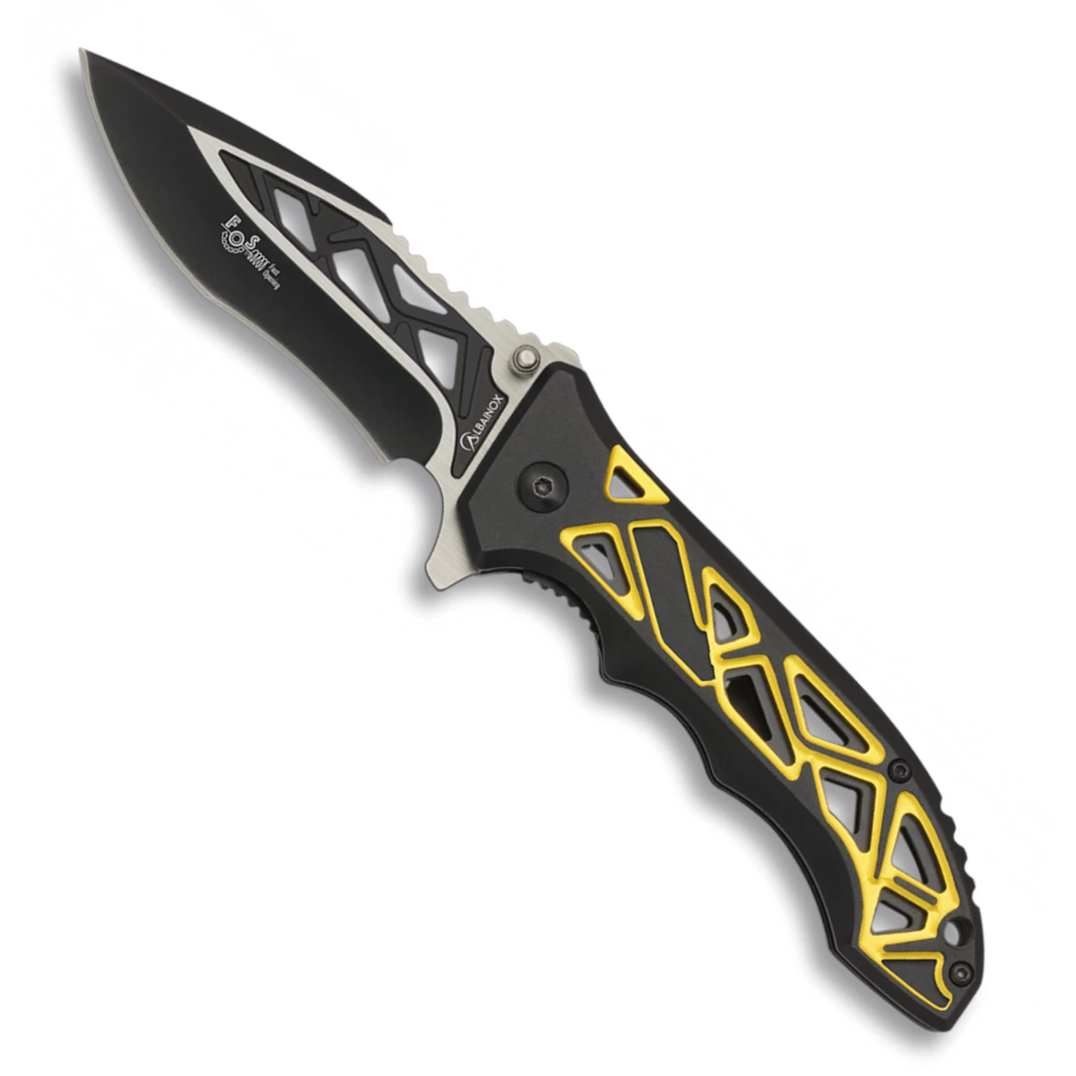 Couteau automatique Albainox 19917-A : lame ajourée en acier inox finition noir et satin d’une longueur de 9.2 cm et manche en aluminium noir et jaune. Système de verrouillage de la lame liner lock.
