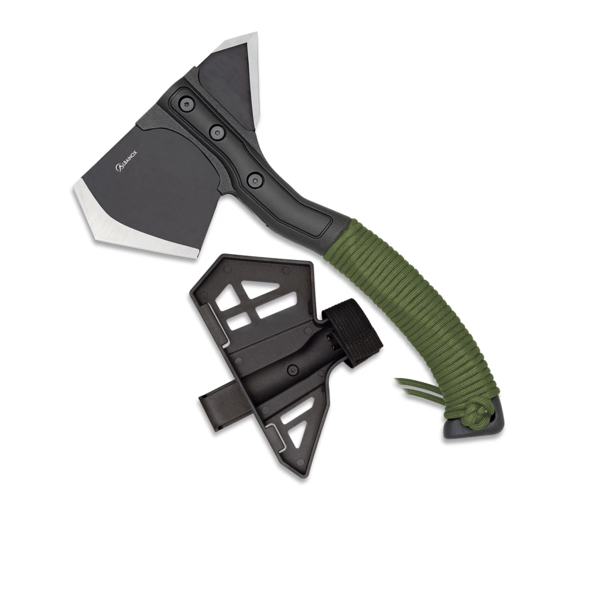 Hache Albainox 32516 acier inox finition noir et manche en fibre encordé. Longueur totale 29 cm. Etui en ABS.